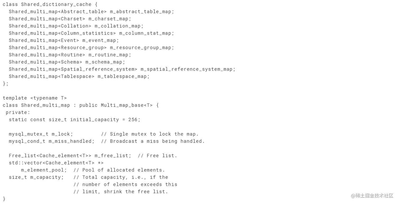 共享缓存是 Server 全局唯一的,使用单例 Shared_dictionary_cache 来实现。与上述局部缓存中 Object_registry 相似,Shared_dictionary_cache 也需要包含针对各种类型对象的缓存。与 Multi_map_base 实现根据 key 类型自动选取对应 hash map 的模版函数相似,Object_registry 和 Shared_dictionary_cache 也都实现了根据访问对象的类型选择对应缓存的 m_map() 函数,能够很大程度上简化函数调用。