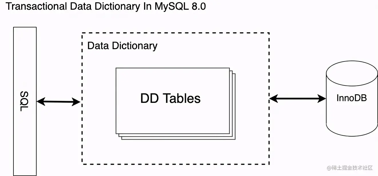 为了解决上述问题,MySQL 在 8.0 中引入了 data dictionary 来进行 Server 层和不同引擎间统一的元数据管理,这些元数据都存储在 InnoDB 引擎的表中,自然的支持原子性,且 Server 层和引擎层共享一份元数据,不再存在不同步的问题。