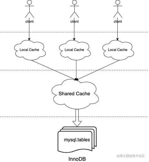 为了避免每次对元数据对象的访问都需要去持久存储中读取多个表的数据,使生成的元数据内存对象能够复用,data dictionary 实现了两级缓存的架构,第一级是 client local 独享的,核心数据结构为 Local_multi_map,用于加速在当前线程中对于相同对象的重复访问,同时在当前线程涉及对 DD 对象的修改(DDL)时管理 committed、uncommitted、dropped 几种状态的对象。第二级就是比较常见的多线程共享的缓存,核心数据结构为 Shared_multi_map,包含着所有线程都可以访问到其中的对象,所以会做并发控制的处理。