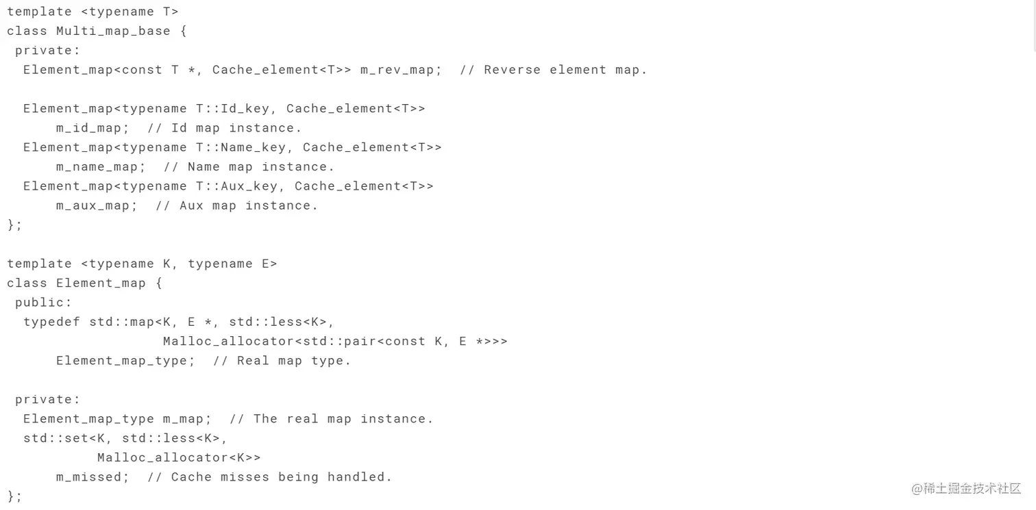 之所以叫 Multi_map_base,是因为其中包含了多个 hash map,适合用户根据不同类型的 key 来获取缓存对象,比如 id、name、DD cache 本身等。Element_map 就是对 std::map 的一个封装,key 为前述几种类型之一,value 为 DD cache 对象指针的一个封装 Cache_element,封装了对象本身和引用计数。