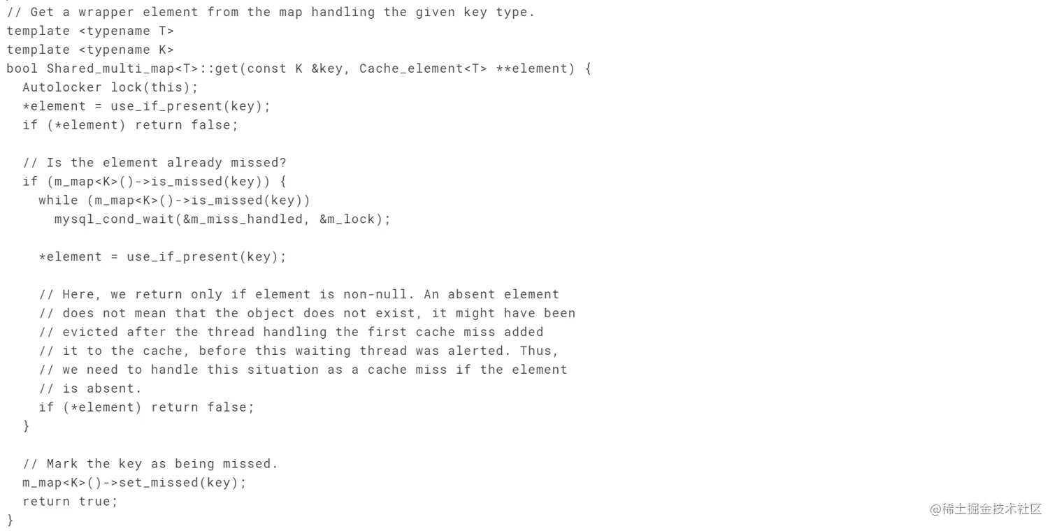 由于开表访问 DD tables,构建 DD cache object 的过程相对耗时,不会一直给 Shared_multi_map 加锁,因此需要对并发访问的 client 做并发控制。DD 的实现方法是第一个访问的 client 会将 cache miss 的 key 加入到 Shared_multi_map的 m_missed 集合中,这个集合包含着现在所有正在读取元数据的对象 key 值。之后访问的 client 看到目标 key 值在 m_missed 集合中就会进入等待。