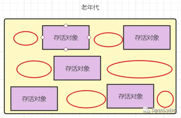 最后一个缺点, 在本节的开头曾提到, CMS是一款基于“标记-清除”算法实现的收集器, 如果读者对前面这部分介绍还有印象的话, 就可能想到这意味着收集结束时会有大量空间碎片产生。(如下红圈所示)