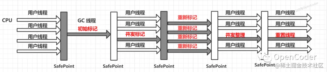 比如我们常见的机器是2核4G,那么分配给CMS的回收线程数= (2+3)/4 =1 个,直接占据了一半的CPU资源