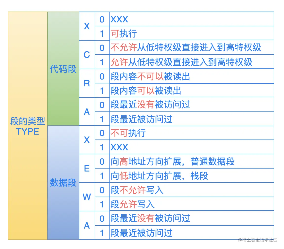 TYPE (bit11 ~ 8):用来描述段的一些属性,例如:可读、可写、扩展方向、代码段的执行特性等等。