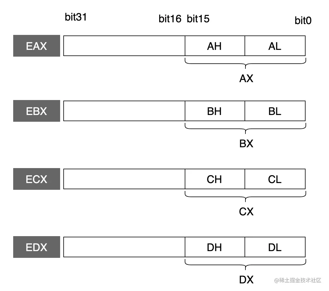 在 32 位处理器中,依然可以兼容 16 位的处理模式,此时依然使用 16 位的寄存器;