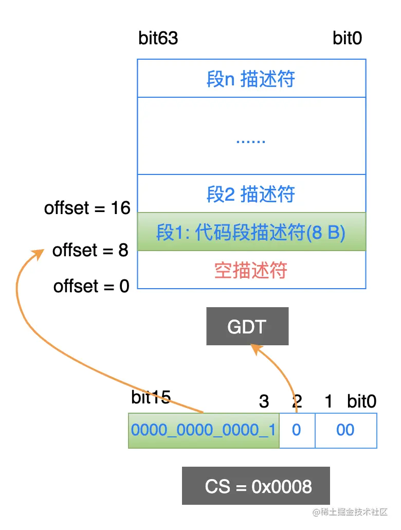 描述符索引是 1,表示这个段描述符在 GDT 中的第 1 个条目中。由于每一个描述符占用 8 个字节,因此这个描述符的开始地址位于 GDT 中的偏移地址为 8 的位置(1 * 8 = 8);