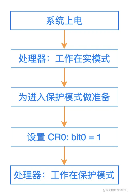 在处理器内部,有一个寄存器 CR0。这个寄存器的 bit0 位的值,就决定了当前的工作模式: