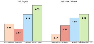 我们使用Google的一些TTS数据集训练了WaveNet,以便我们评估其性能。下图显示了WaveNets的质量,从1到5,与Google目前最好的TTS系统(参数 和 连接)相比,以及使用Mean Opinion Scores(MOS)的人类语音 。MOS是主观声音质量测试的标准测量,并且是在人类受试者的盲测中获得的(来自100个测试句子的500多个评级)。正如我们所看到的,WaveNets将美国英语和普通话的现状和人类表现之间的差距缩小了50%以上。