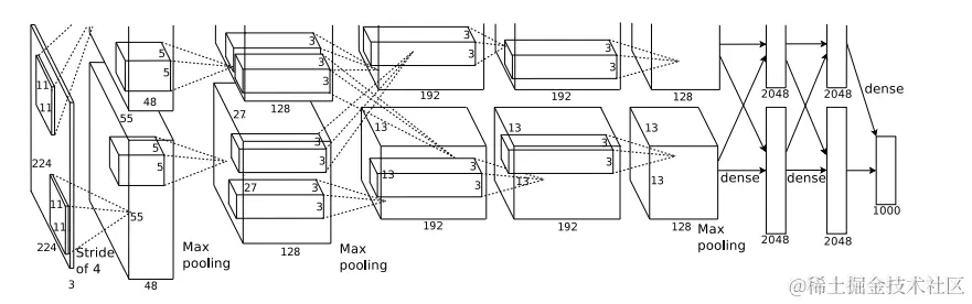 - 因为使用多GPU训练,所以可以看到第一层卷积层后有两个完全一样的分支,以加速训练。