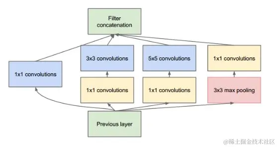 上图结构就是Inception,结构里的卷积stride都是1,另外为了保持特征响应图大小一致,都用了零填充。最后每个卷积层后面都立刻接了个ReLU层。在输出前有个叫concatenate的层,直译的意思是“并置”,即把4组不同类型但大小相同的特征响应图一张张并排叠起来,形成新的特征响应图。Inception结构里主要做了两件事:1. 通过3×3的池化、以及1×1、3×3和5×5这三种不同尺度的卷积核,一共4种方式对输入的特征响应图做了特征提取。2. 为了降低计算量。同时让信息通过更少的连接传递以达到更加稀疏的特性,采用1×1卷积核来实现降维。