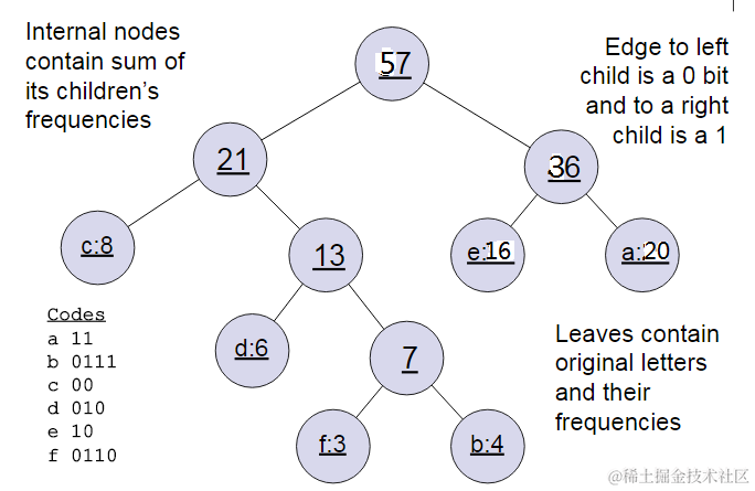 在word2vec中,约定编码方式和上面的例子相反,即约定左子树编码为1,右子树编码为0,同时约定左子树的权重不小于右子树的权重。