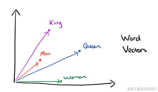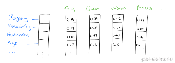 比如下图我们将词汇表里的词用"Royalty","Masculinity", "Femininity"和"Age"4个维度来表示,King这个词对应的词向量可能是(0.99,0.99,0.05,0.7)(0.99,0.99,0.05,0.7)。当然在实际情况中,我们并不能对词向量的每个维度做一个很好的解释。