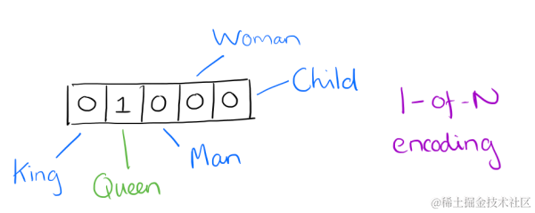 用词向量来表示词并不是word2vec的首创,在很久之前就出现了。最早的词向量是很冗长的,它使用是词向量维度大小为整个词汇表的大小,对于每个具体的词汇表中的词,将对应的位置置为1。比如我们有下面的5个词组成的词汇表,词"Queen"的序号为2, 那么它的词向量就是(0,1,0,0,0)(0,1,0,0,0)。同样的道理,词"Woman"的词向量就是(0,0,0,1,0)(0,0,0,1,0)。这种词向量的编码方式我们一般叫做1-of-N representation或者one hot representation.