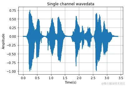 | 1234567891011121314151617181920 | import wave``import matplotlib.pyplot as plt``import numpy as np``import os filepath ``= "./data/" #添加路径``filename``= os.listdir(filepath) ``#得到文件夹下的所有文件名称 ``f ``= wave.``open``(filepath``+``filename[``1``],``'rb'``)``params ``= f.getparams()``nchannels, sampwidth, framerate, nframes ``= params[:``4``]``strData ``= f.readframes(nframes)``#读取音频,字符串格式``waveData ``= np.fromstring(strData,dtype``=``np.int16)``#将字符串转化为int``waveData ``= waveData``*``1.0``/``(``max``(``abs``(waveData)))``#wave幅值归一化``# plot the wave``time ``= np.arange(``0``,nframes)``*``(``1.0 / framerate)``plt.plot(time,waveData)``plt.xlabel(``"Time(s)"``)``plt.ylabel(``"Amplitude"``)``plt.title(``"Single channel wavedata"``)``plt.grid(``'on'``)``#标尺,on:有,off:无。 |