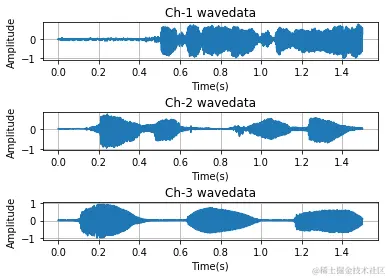 | 1234567891011121314151617181920212223242526272829303132333435363738394041424344 | # -*- coding: utf-8 -*-``"""``Created on Wed May 3 12:15:34 2017 @author: Nobleding``""" import wave``import matplotlib.pyplot as plt``import numpy as np``import os filepath ``= "./data/" #添加路径``filename``= os.listdir(filepath) ``#得到文件夹下的所有文件名称 ``f ``= wave.``open``(filepath``+``filename[``0``],``'rb'``)``params ``= f.getparams()``nchannels, sampwidth, framerate, nframes ``= params[:``4``]``strData ``= f.readframes(nframes)``#读取音频,字符串格式``waveData ``= np.fromstring(strData,dtype``=``np.int16)``#将字符串转化为int``waveData ``= waveData``*``1.0``/``(``max``(``abs``(waveData)))``#wave幅值归一化``waveData ``= np.reshape(waveData,[nframes,nchannels])``f.close()``# plot the wave``time ``= np.arange(``0``,nframes)``*``(``1.0 / framerate)``plt.figure()``plt.subplot(``5``,``1``,``1``)``plt.plot(time,waveData[:,``0``])``plt.xlabel(``"Time(s)"``)``plt.ylabel(``"Amplitude"``)``plt.title(``"Ch-1 wavedata"``)``plt.grid(``'on'``)``#标尺,on:有,off:无。``plt.subplot(``5``,``1``,``3``)``plt.plot(time,waveData[:,``1``])``plt.xlabel(``"Time(s)"``)``plt.ylabel(``"Amplitude"``)``plt.title(``"Ch-2 wavedata"``)``plt.grid(``'on'``)``#标尺,on:有,off:无。``plt.subplot(``5``,``1``,``5``)``plt.plot(time,waveData[:,``2``])``plt.xlabel(``"Time(s)"``)``plt.ylabel(``"Amplitude"``)``plt.title(``"Ch-3 wavedata"``)``plt.grid(``'on'``)``#标尺,on:有,off:无。``plt.show() |