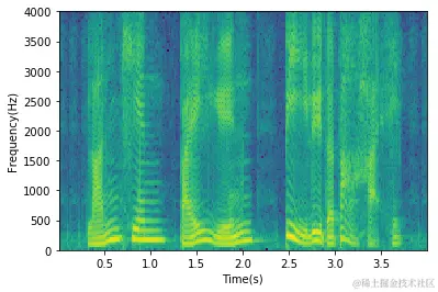 | 1234567891011121314151617181920 | import wave``import matplotlib.pyplot as plt``import numpy as np``import os filepath ``= "./data/" #添加路径``filename``= os.listdir(filepath) ``#得到文件夹下的所有文件名称 ``f ``= wave.``open``(filepath``+``filename[``0``],``'rb'``)``params ``= f.getparams()``nchannels, sampwidth, framerate, nframes ``= params[:``4``]``strData ``= f.readframes(nframes)``#读取音频,字符串格式``waveData ``= np.fromstring(strData,dtype``=``np.int16)``#将字符串转化为int``waveData ``= waveData``*``1.0``/``(``max``(``abs``(waveData)))``#wave幅值归一化``waveData ``= np.reshape(waveData,[nframes,nchannels]).T``f.close()``# plot the wave``plt.specgram(waveData[``0``],Fs ``= framerate, scale_by_freq ``= True``, sides ``= 'default'``)``plt.ylabel(``'Frequency(Hz)'``)``plt.xlabel(``'Time(s)'``)``plt.show() |