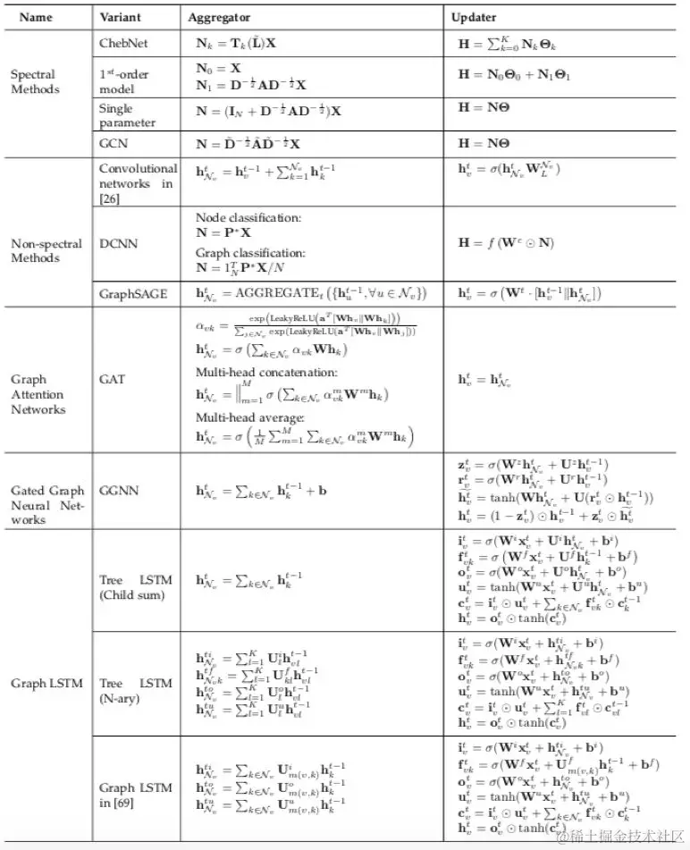 文章还对于不同的信息传递方式进行了公式化总结。简单来说,信息传递函数主要包括信息收集(agggregation)和节点信息更新(update)两个部分,在表格中列出了每种方法的不同配置。