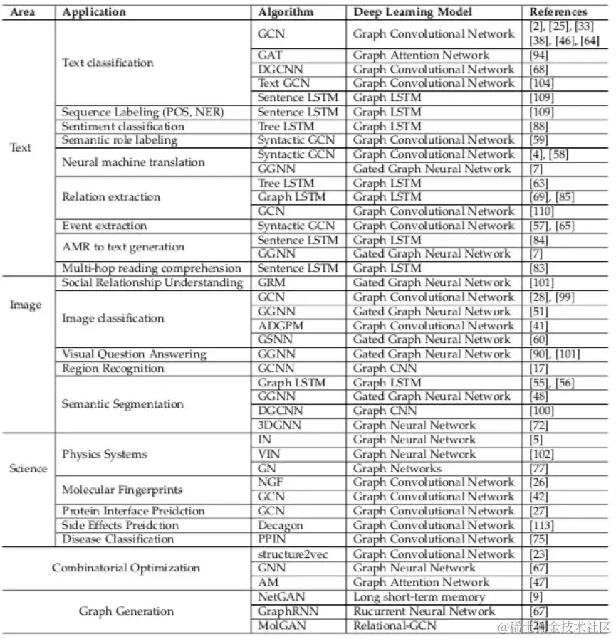在结构化场景中,GNN 被广泛应用在社交网络、推荐系统、物理系统、化学分子预测、知识图谱等领域。文章中主要介绍了其在物理、化学、生物和知识图谱中的部分应用。在非结构领域,文章主要介绍了在图像和文本中的应用。在其他领域,文章介绍了图生成模型以及使用 GNN 来解决组合优化问题的场景。