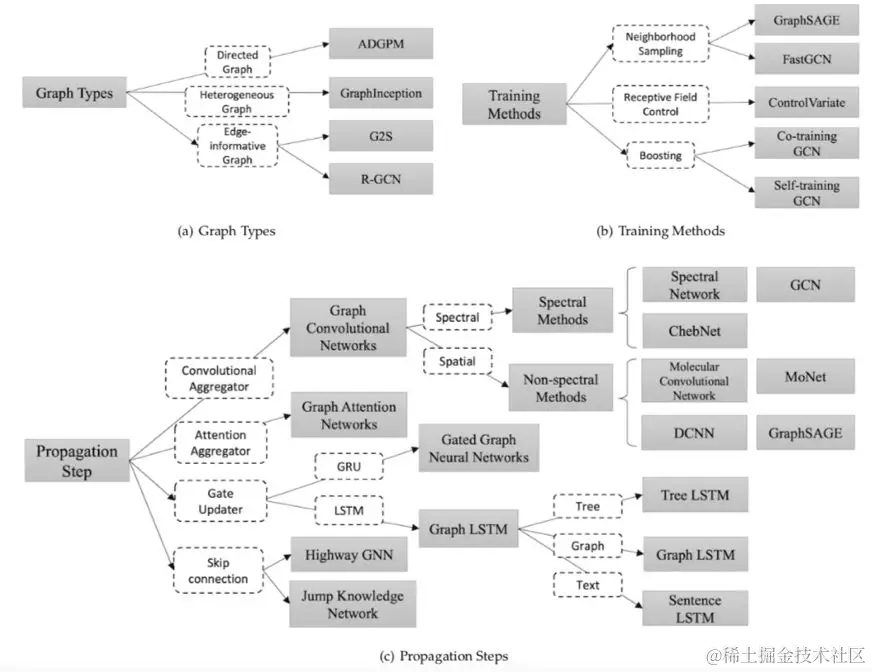 在 2.2.3 节中,文章介绍了 GNN 的不同训练方法。譬如 GraphSAGE 从附近的邻居收集信息,并且能够应用于 inductive learning 领域;FastGCN 使用了 importance sampling 的方法,使用采样替代使用节点所有的邻居信息,加快了训练过程。