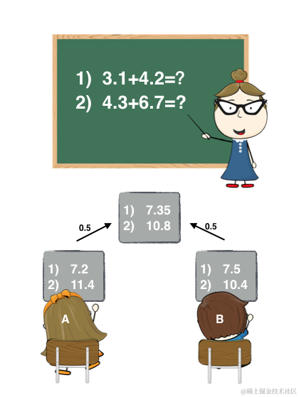 老师出了两道加法题,A同学和B同学答案的加权要比A和B各自回答的要精确。