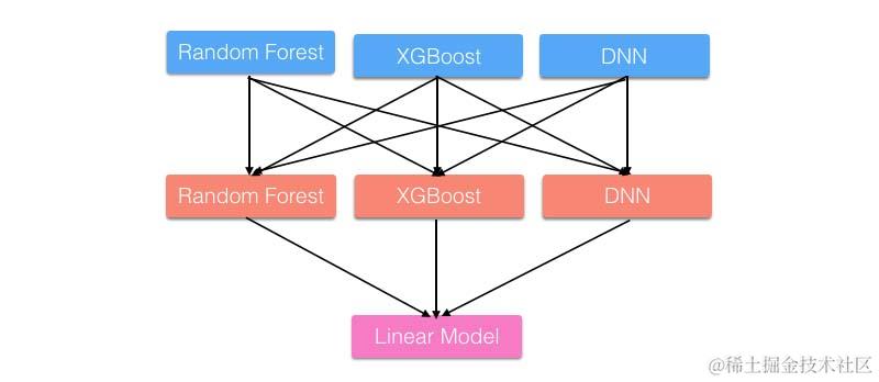 Stacking是用新的模型(次学习器)去学习怎么组合那些基学习器,它的思想源自于Stacked Generalization这篇论文。如果把Bagging看作是多个基分类器的线性组合,那么Stacking就是多个基分类器的非线性组合。Stacking可以很灵活,它可以将学习器一层一层地堆砌起来,形成一个网状的结构,如下图: