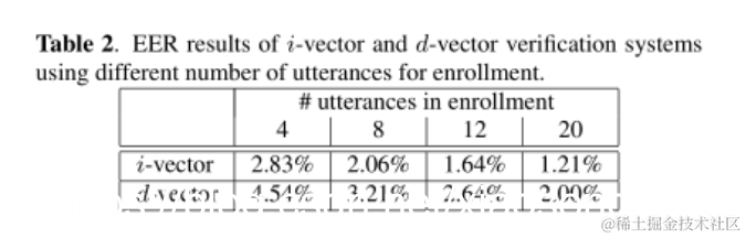 EER结果列于表2中。它表明,随着注册话语数量的增加,两个SV系统的表现都更好。 两种系统的趋势相似。