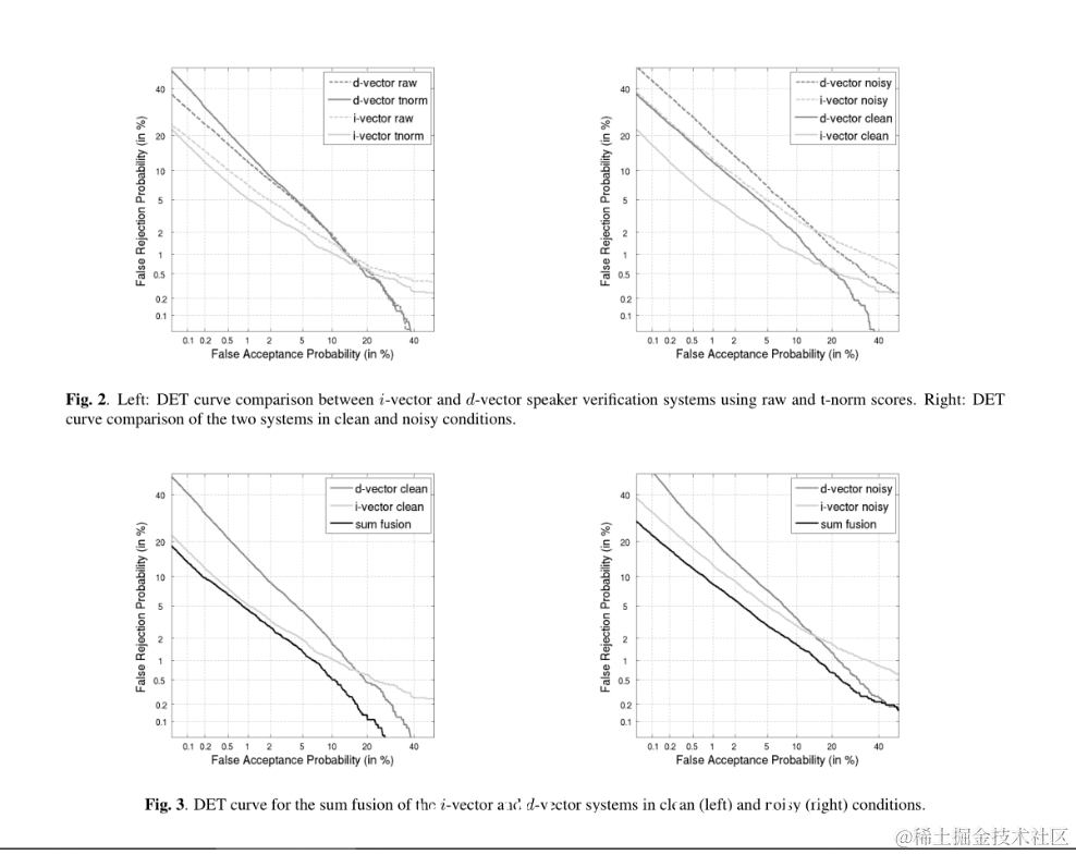 i-矢量系统的整体性能优于d-矢量系统:使用i-矢量t-范数得分的2.83%EER与使用d-矢量原始得分的4.54%相比。 然而,在低假拒绝区域中,如图2中的图的右下部分所示,d向量系统优于i向量系统。