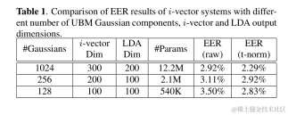 表1.具有不同数量的UBM高斯分量,i向量和LDA输出维度的i向量系统的EER结果的比较。