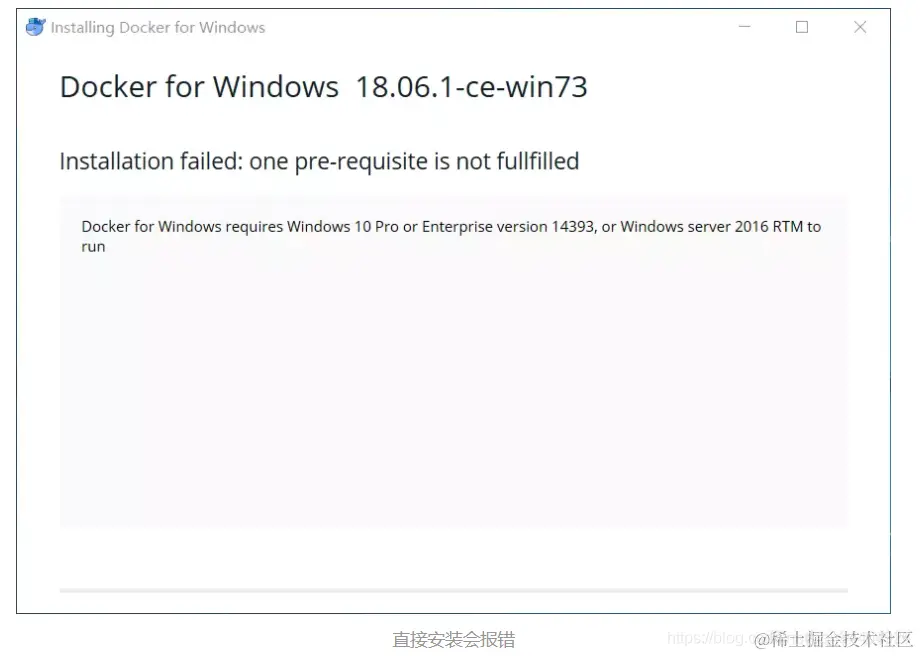 如图,由于Docker Desktop会在安装的时候检测系统版本,直接安装会显示安装失败。所以需要改下注册表绕过安装检测。