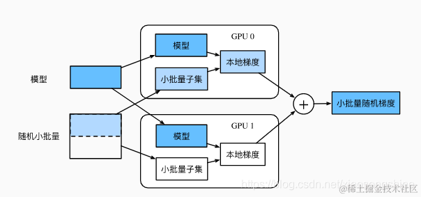 假设一台机器上有k块GPU。给定需要训练的模型,每块GPU及其相应的显存将分别独立维护一份完整的模型参数。在模型训练的任意一次迭代中,给定一个随机小批量,我们将该批量中的样本划分成k份并分给每块显卡的显存一份。然后,每块GPU将根据相应显存所分到的小批量子集和所维护的模型参数分别计算模型参数的本地梯度。接下来,我们把k块显卡的显存上的本地梯度相加,便得到当前的小批量随机梯度。之后,每块GPU都使用这个小批量随机梯度分别更新相应显存所维护的那一份完整的模型参数。下图描绘了使用2块GPU的数据并行下的小批量随机梯度的计算。