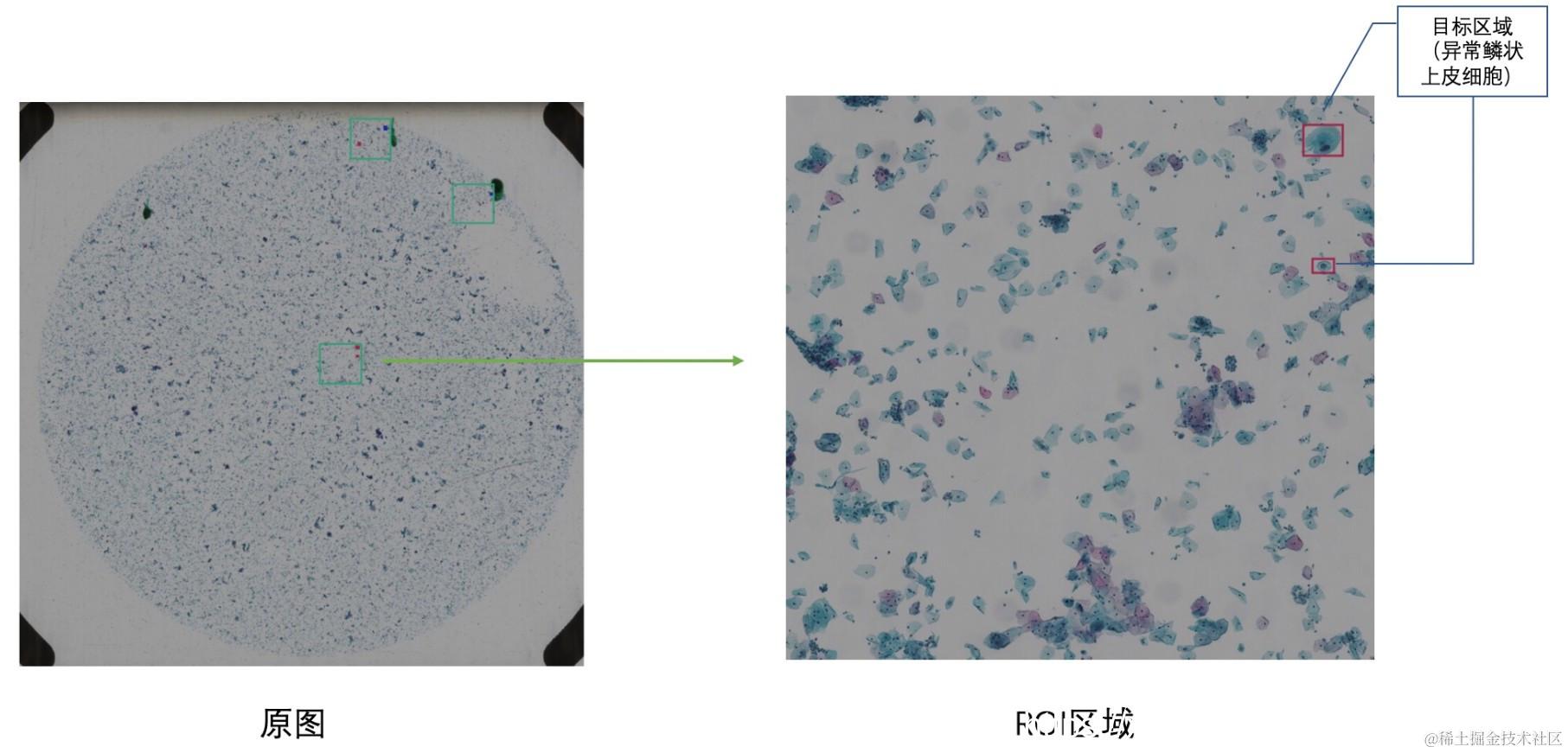 具体地,对于每张宫颈癌细胞学图片,参赛选手通过检测模型输出整张图像多个预测框位置和置信度,我们后台评测算法会随机生成一些ROI区域,且只在ROI区域中计算mAP。