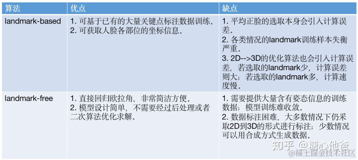 两类方法各有利弊,在项目中都能得到不用程度的应用。下面我们来看看上述两类方式的优缺点对比,为了方便大家区分,我们这里称第一类算法为landmark-based,第二类为landmark-free。