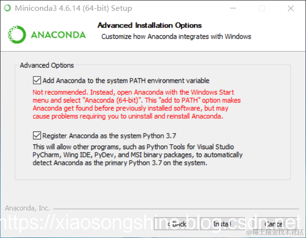 注意这两个都要勾选,一个是让我们可以直接在cmd使用conda指令,第二个是把miniconda自带的python3.7作为系统python。
