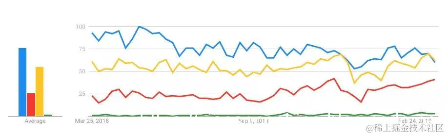 下面谷歌的图表显示了过去一年的搜索兴趣。TensorFlow为蓝色,Keras为黄色,PyTorch为红色,fastai为绿色。可以看出TensorFlow总体呈现下降趋势,而PyTorch却呈现持续增长姿态,不断缩小与TensorFlow的距离。