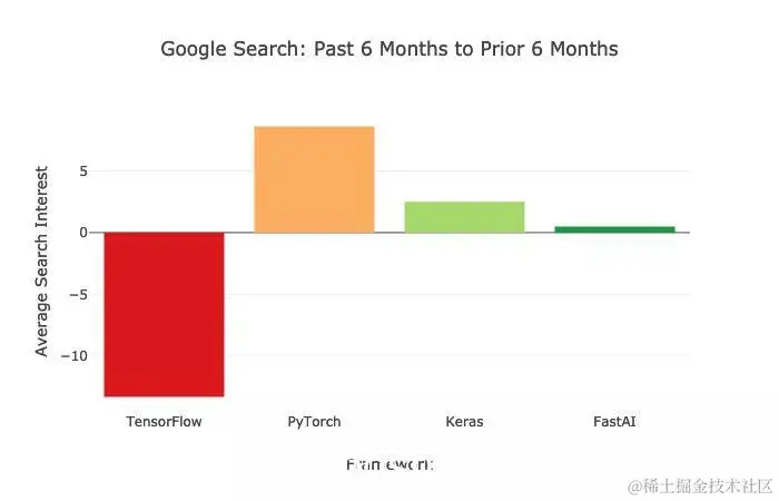下图通过搜索全世界对机器学习和人工智能类别的兴趣(Google Interest),采用过去六个月的平均兴趣分数,并将其与前六个月的平均兴趣分数进行了比较。可以看出,TensorFlow 的平均兴趣分数处于下降状态,PyTorch却呈上升趋势。