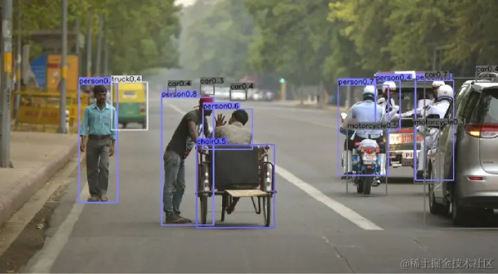 image 2/10 data/samples/17790319373_bd19b24cfc_k.jpg: 320x512 9 persons, 4 cars, 2 motorcycles, 1 trucks, 1 benchs, 1 chairs, Done. (0.019s)