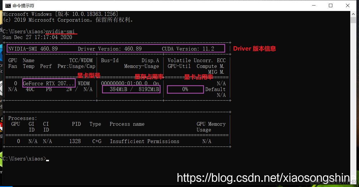 进入“cmd”命令控制符窗口,输入“nvidia-smi”,成功安装后会输出以下内容:
