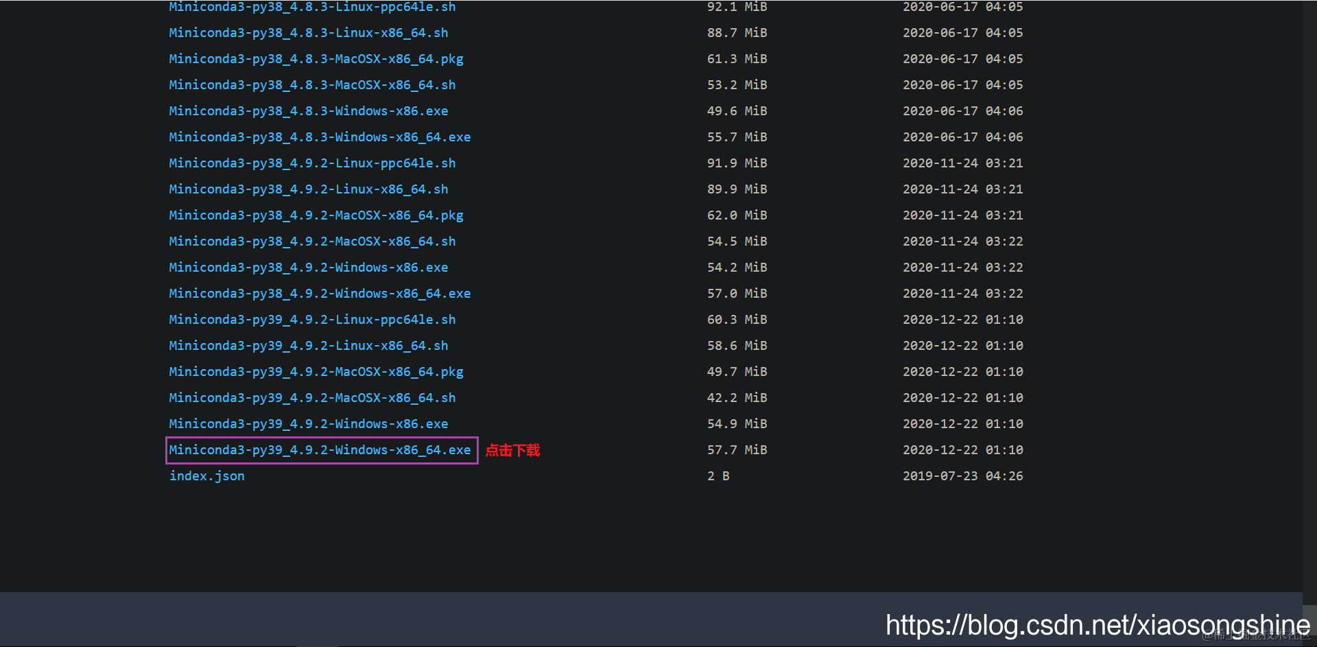 这里笔者使用的是Miniconda3-py39_4.9.2-Windows-x86_64.exe,下载链接: