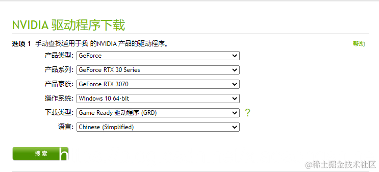 安装如下方式搜索驱动,根据 GPU 显卡型号进行选择,“操作系统”与“下载类型”与下方一致即可,点击搜索按钮(其实 Linux 系统的驱动下载也类似,操作系统选择 Linux 即可