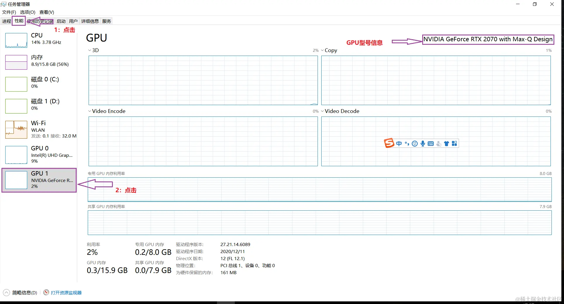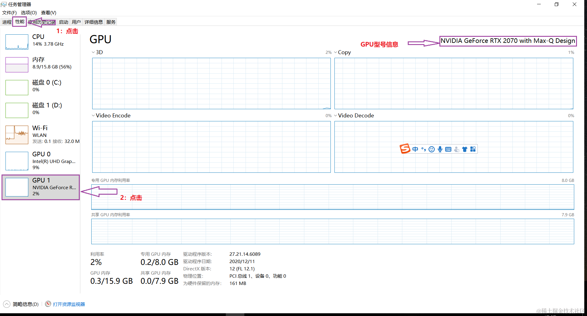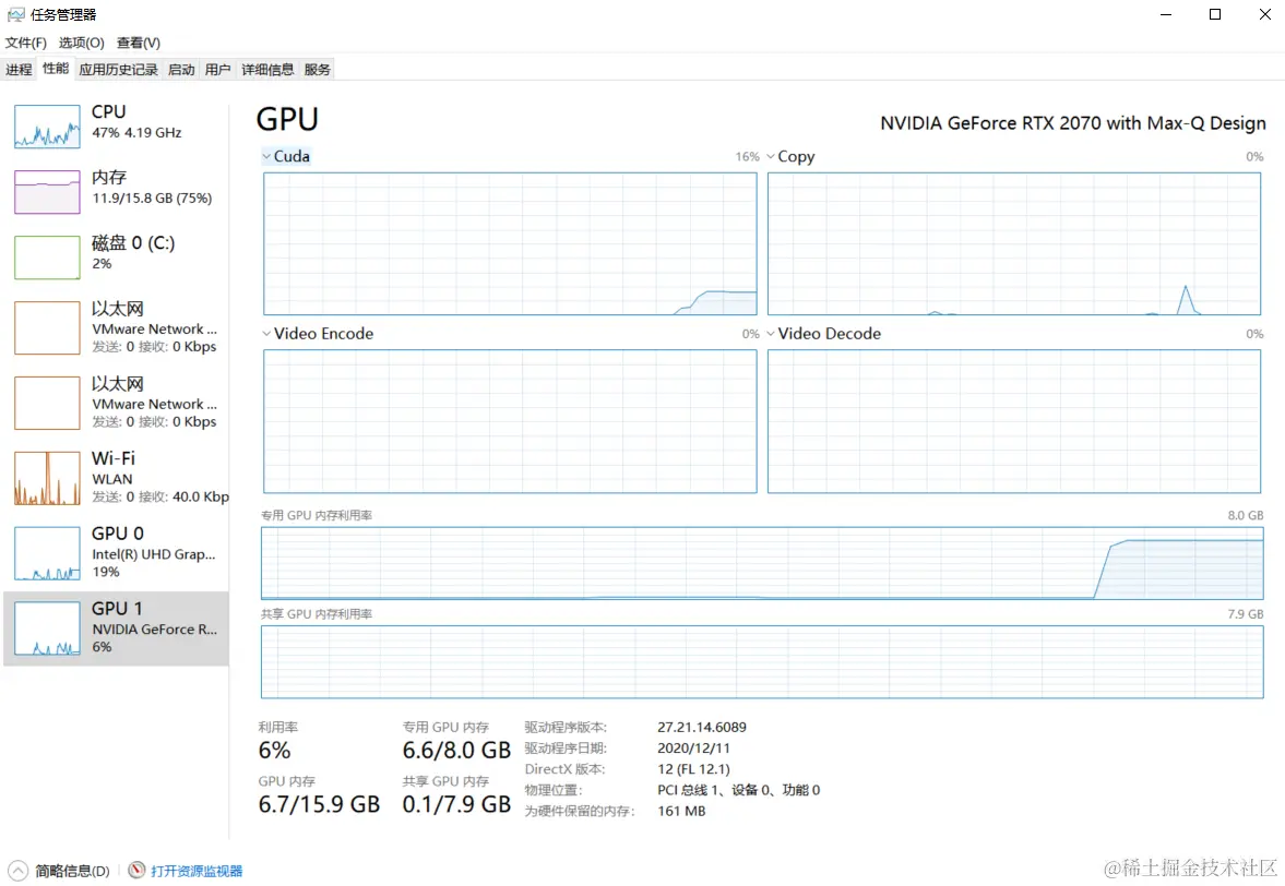 进入“任务管理器”后选择“性能”,如果有 GPU1(GPU0 为集成显卡)则代表是拥有独显,此时再来查看 GPU 型号即可:可以看到笔者的 GPU 为“NVIDIA GeForce RTX 2070”,先记录下来后面会用到。如果没有“NVIDIA”的前缀则不能使用。