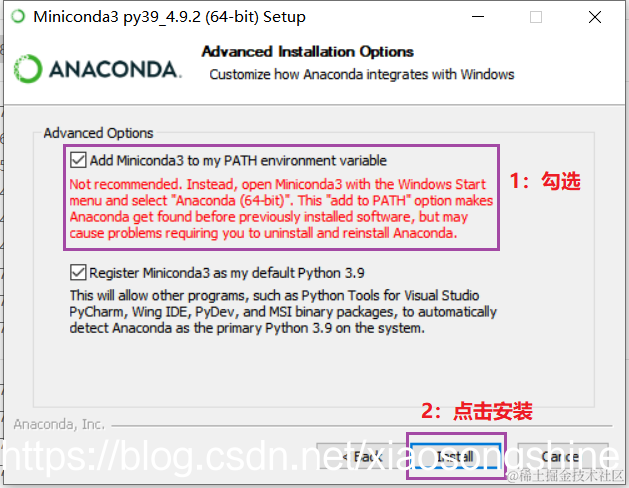 下载完成后进行安装即可,这里注意“Add Miniconda to my PATH environment variable”要勾选上,这是设置环境变量,之后就可以直接在“CMD”界面使用“conda”指令。