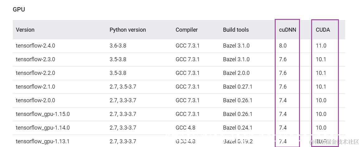可以看出,如果是安装 TensorFlow 2.4 则对应 CUDA=11.0,cuDNN=8.0;TensorFlow 2.1-2.3 则对应CUDA=10.1,cuDNN=7.6;TensorFlow 2.0,对应CUDA=10.0,cuDNN=7.6;TensorFlow 1.13.1-1.15.0,对应CUDA=10.0,cuDNN=7.6。