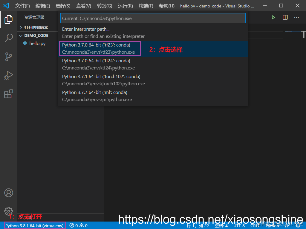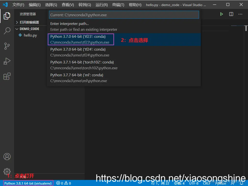 然后就是选择Python,在选择Python时,需要打开一个.py文件,出现下方Python环境信息: