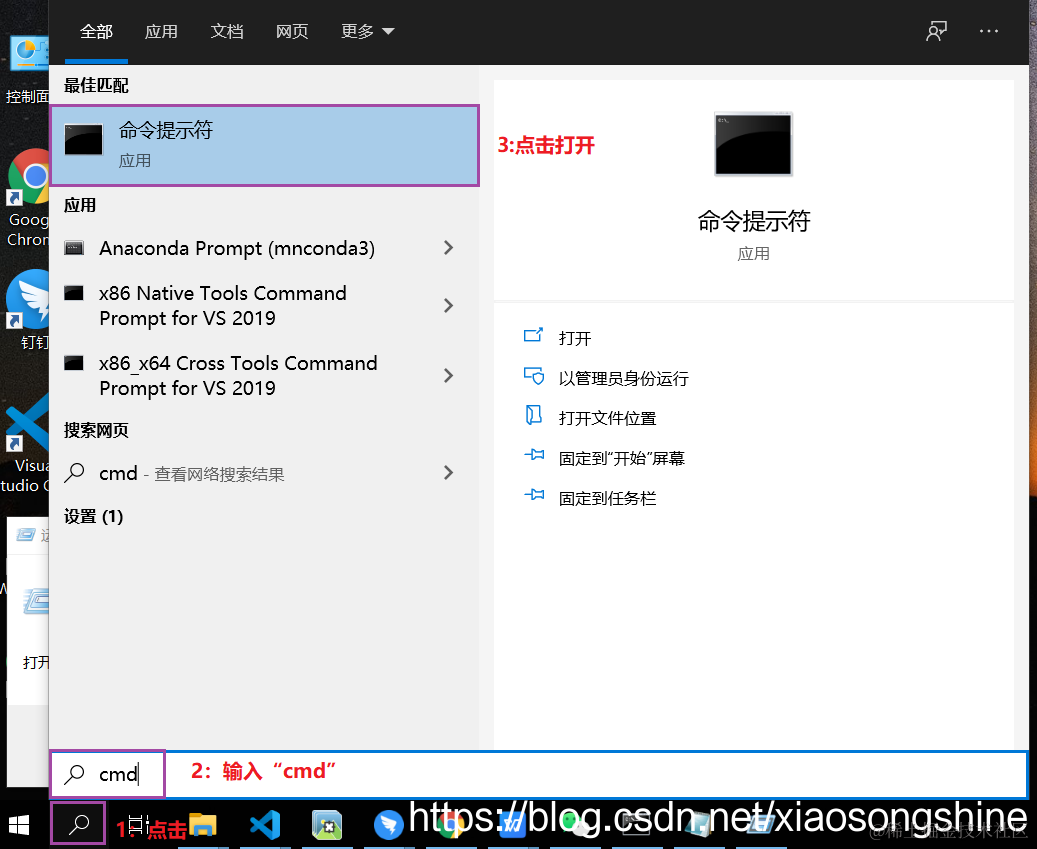下面就可以测试是否安装成功,点击下方搜索按钮,输入“cmd”,再选择“命令控制符”