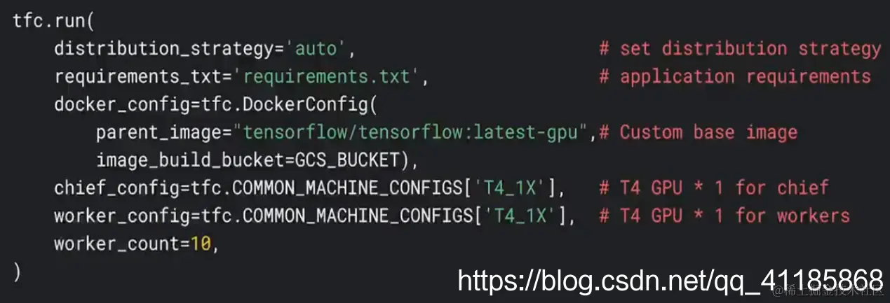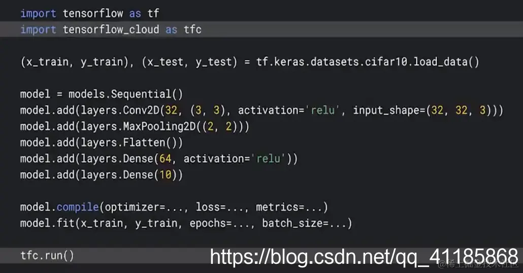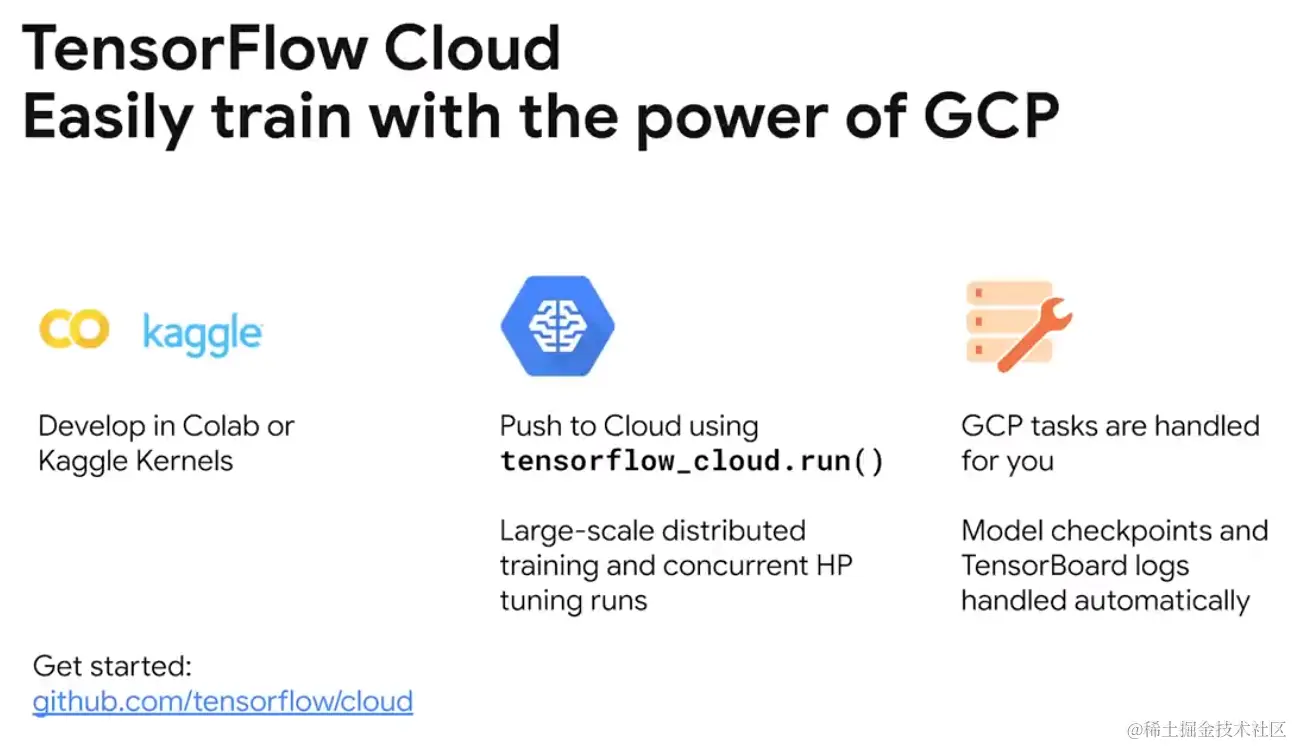 TensorFlow Cloud 可以实现云端部署模型,可以将训练工作发送到可扩容的云基础设施上运行,而无需离开终端。它作为 python 的包,为从本地调试到分布式训练和 TensorFlow Cloud 上参数调优的无缝转换提供 API。