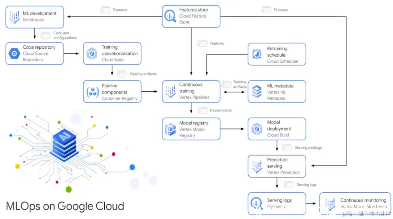 这里特别强调Vertex AI引入的新的 MLOps 功能,可以使用这个套件放心的管理模型,这套工具消除了复杂的用户自定义模型维护的复杂性,提高了可靠性和可重复性,并且可以团队式的跟踪和管理实验。它还可以监视特征质量,并避免导致训练服务偏斜的常见原因(比如数据分布倾斜),从而实现可靠的 ML 生产部署。