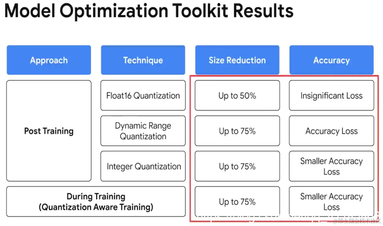 优化模型的工具是 Model Optimization Toolkit,它是一套工具和技术,用于优化模型以使其运行的更小和更快,比如量化和剪枝,精度损失非常小。