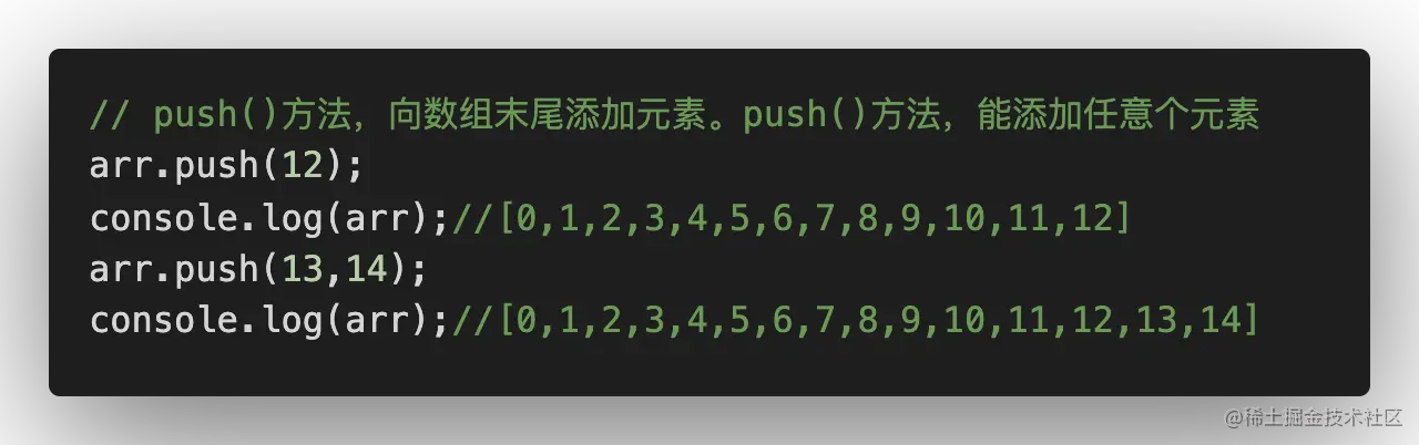 - 方式二:通过push()方法向数组末尾添加元素,该方法可以向数组中添加任意个值