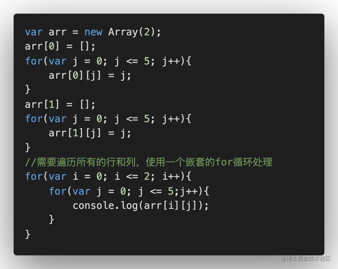 - JavaScript只支持一维数组,并不支持矩阵。但是可以使用数组套数组,实现矩阵或任一多维数组。