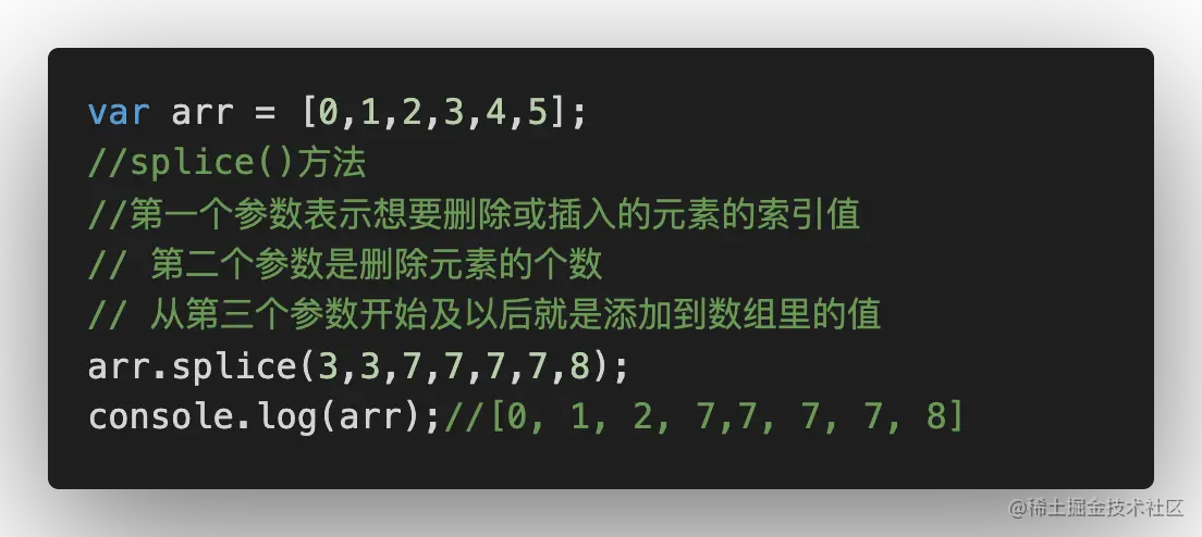 - 上面都是在数组的首位和尾部进行增删,可以通过splice()方法,简单地通过指定位置/索引,就可以删除相应的位置和数量的元素。